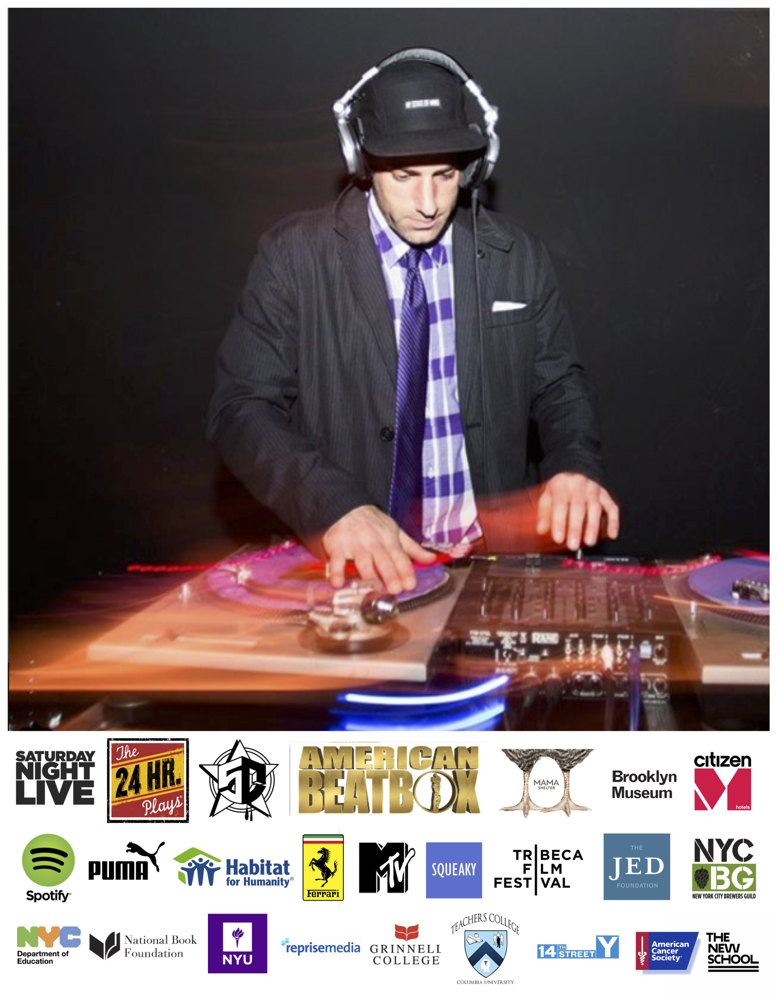 /DJ’d galas for the National Book Award, PEN America, Habit for Humanity, American Cancer Society, 24 Hour Plays, and the 14th st Y, among many others